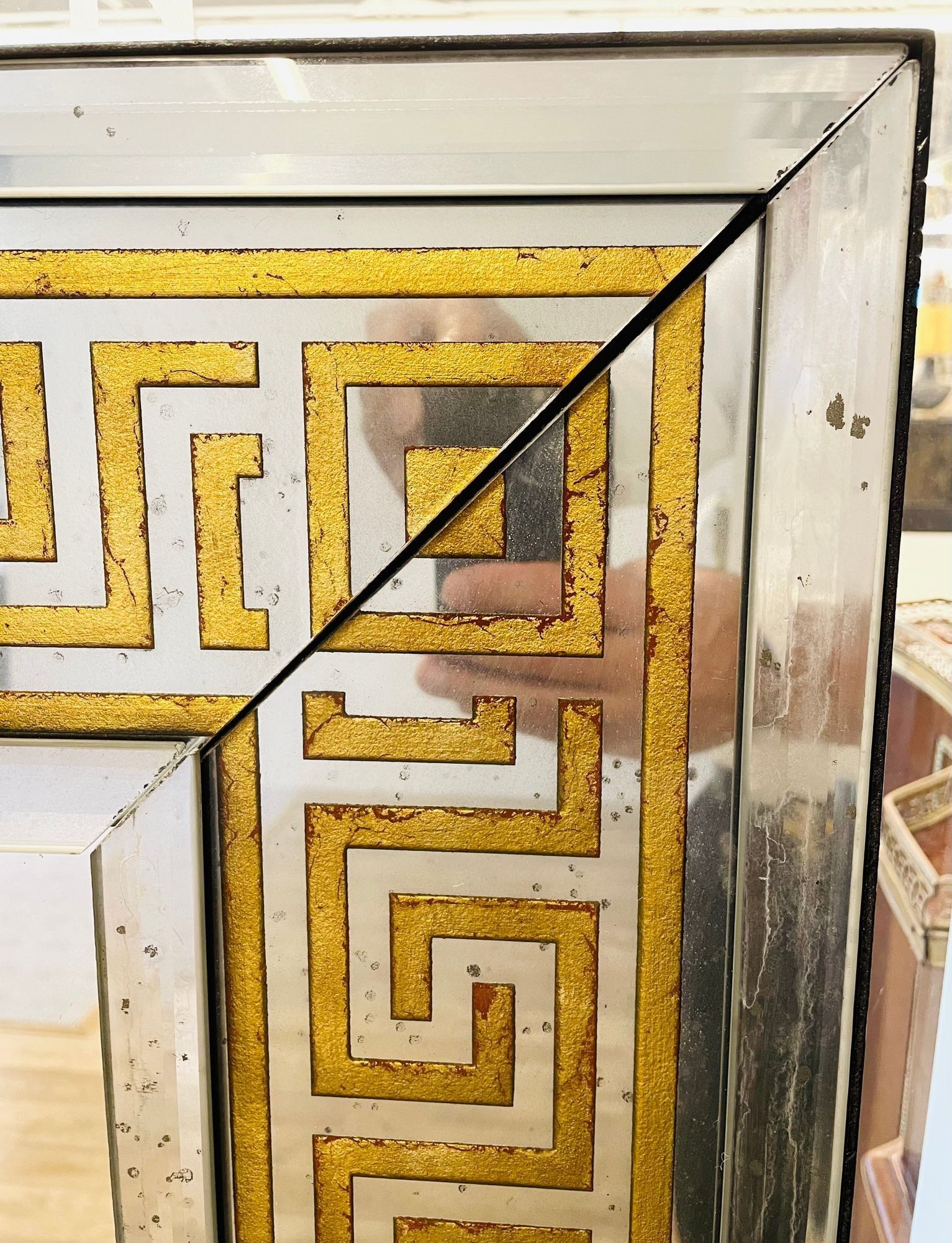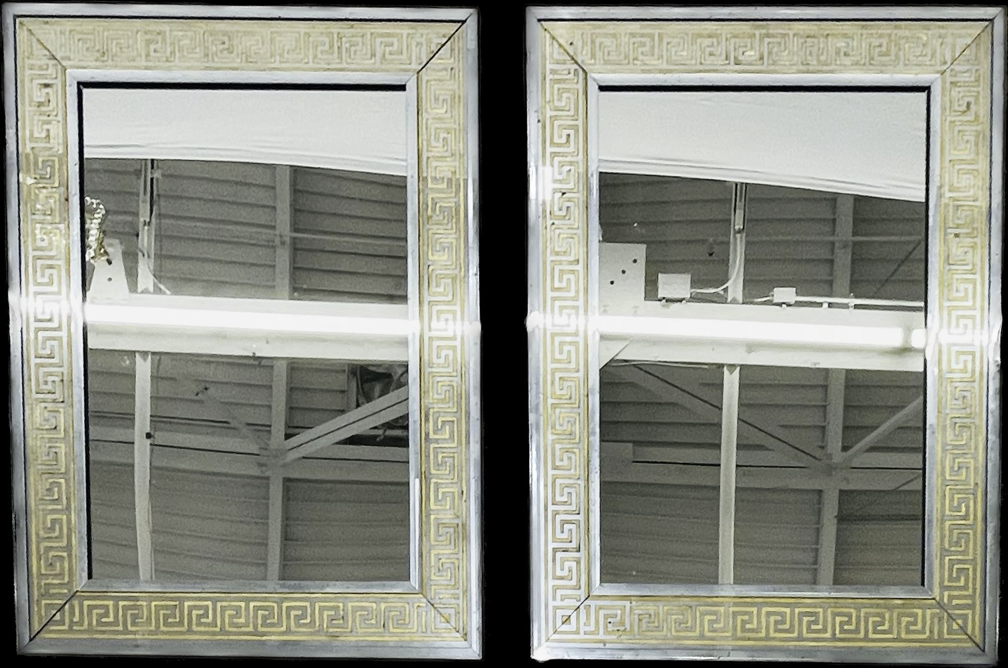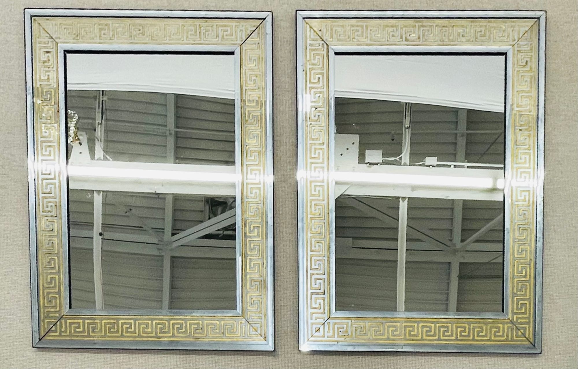 These mirrors have a distinctive design, featuring a large Greek key pattern with a width of 5.5 inches, surrounded by a border of beveled distressed mirrors. The mirrors are backed with solid wood and are framed for hanging, with a clear center mirror panel. This versatile design allows them to be hung either vertically or horizontally, depending on your preference or the desired placement.