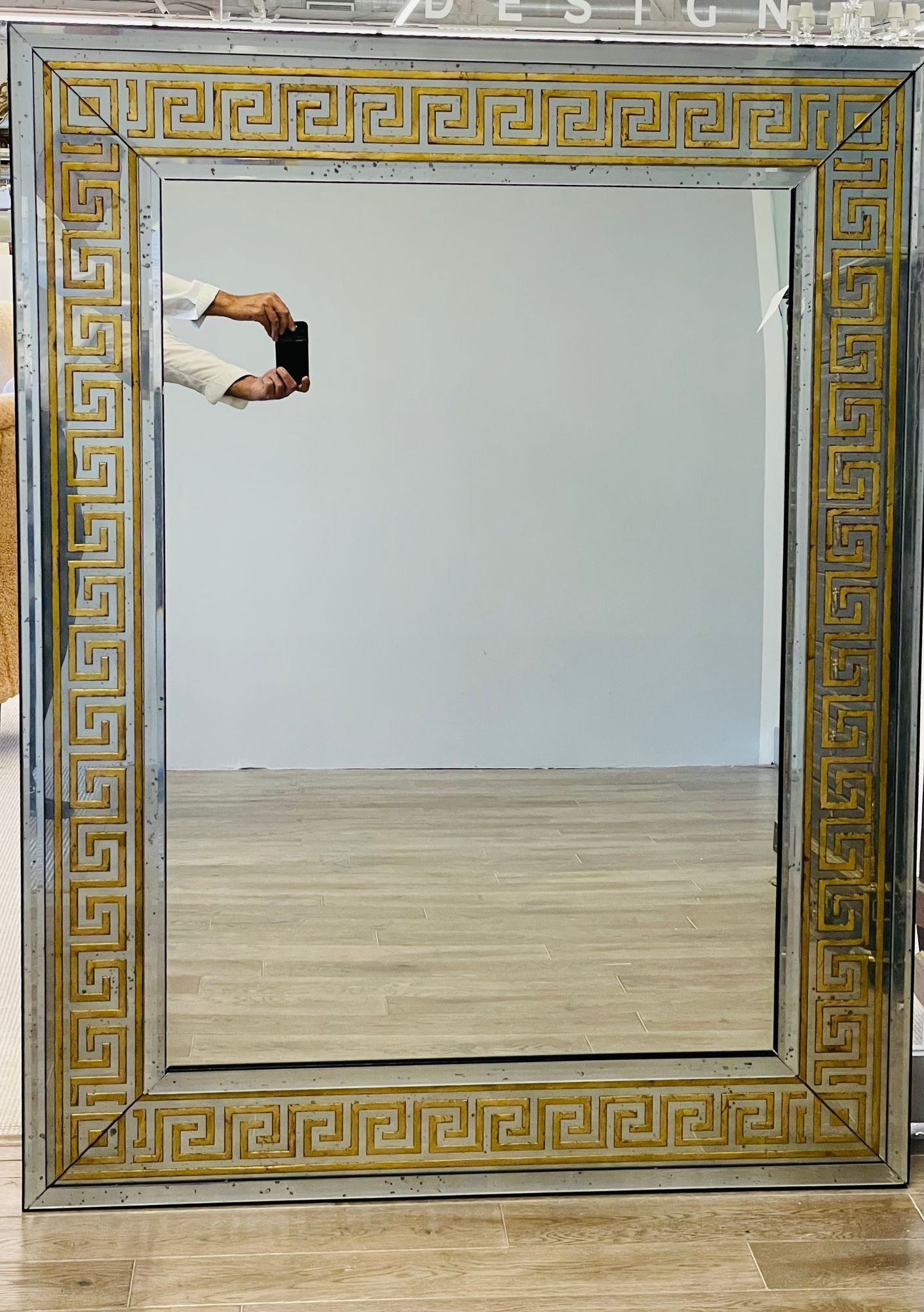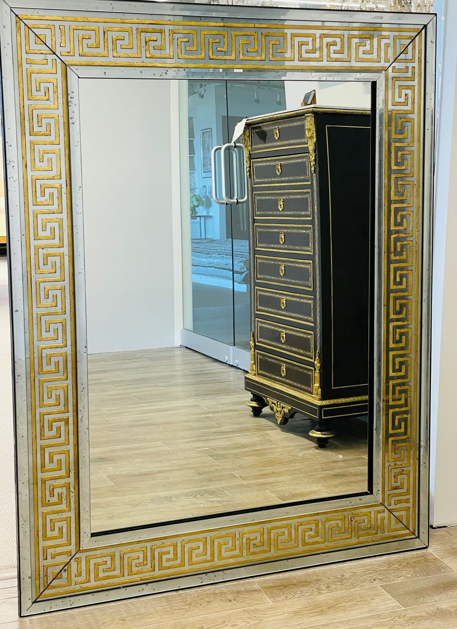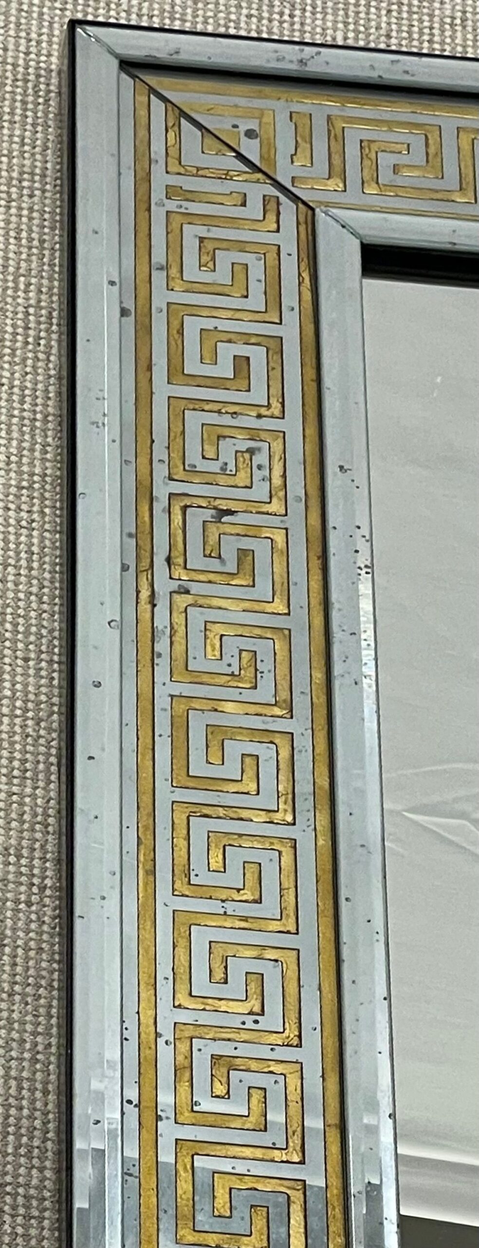 These mirrors have a distinctive design, featuring a large Greek key pattern with a width of 5.5 inches, surrounded by a border of beveled distressed mirrors. The mirrors are backed with solid wood and are framed for hanging, with a clear center mirror panel. This versatile design allows them to be hung either vertically or horizontally, depending on your preference or the desired placement.