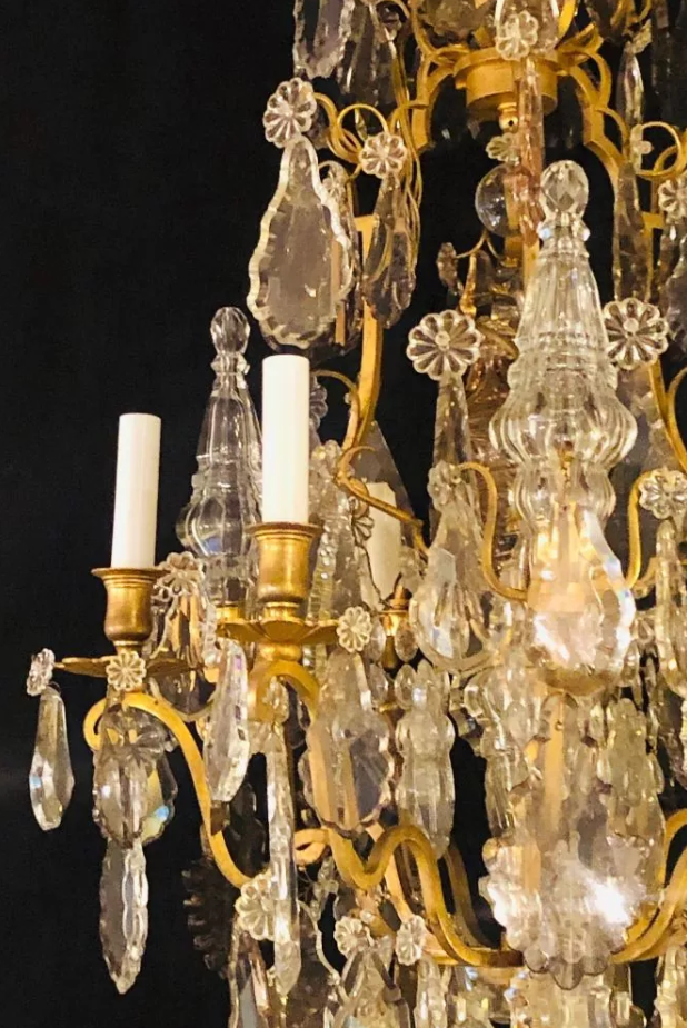 The use of large crystals further enhances the chandelier's aesthetic appeal, as they can catch and reflect light from various angles, producing a sparkling and radiant display. Crystal rosettes on the base add intricate detailing and further contribute to the overall opulent look of the chandelier.