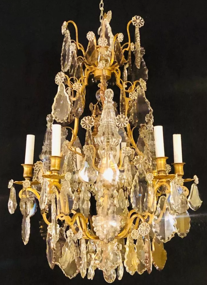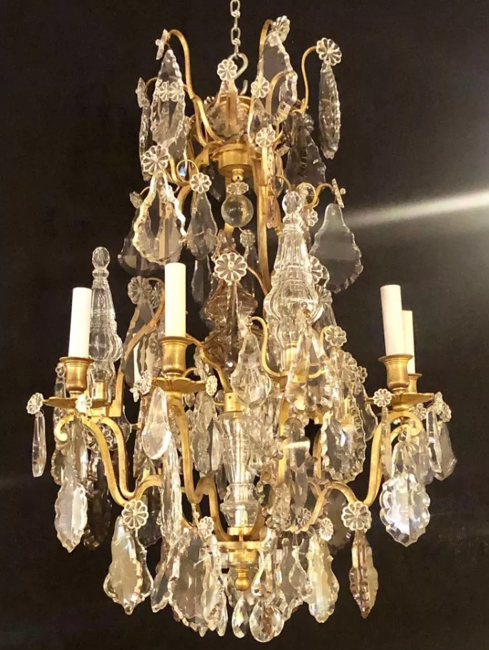 “I have got to share this chandelier. I like it because it’s pretty! It’s from the 1920s, and I love that it has all the armature and the rosettes, but the crystals have sphere points, making them more angular and therefore more modern!”