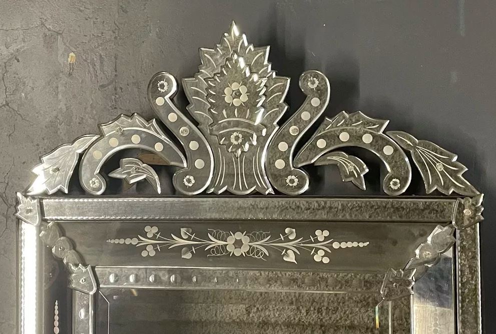 Shimmering Venetian Beveled Glass Mirror with Etched Details + Pediment Top